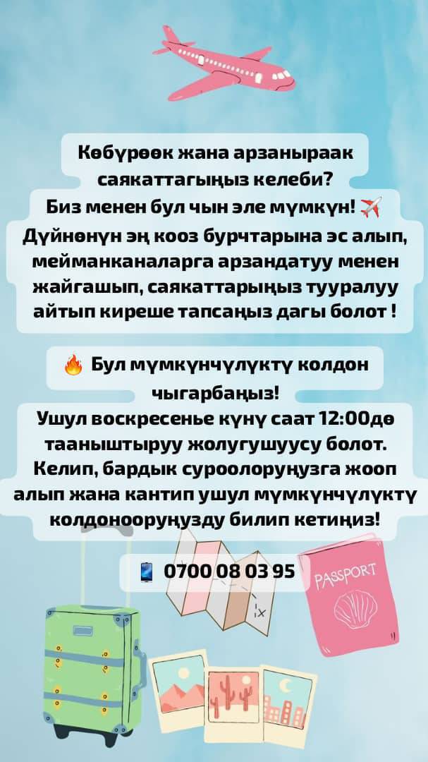 Көбүрөөк жана арзаныраак саякаттагыңыз келеби? Биз менен бул чын эле мүмкүн! ✈️ Дүйнөнүн эң кооз бурчтарына эс алып, мейманканаларга арзандатуу менен жайгашып, саякаттарыңыз тууралуу айтып киреше тапсаңыз дагы болот ! 🔥 Бул мүмкүнчүлүктү колдон чыгарбаңыз! Ушул воскресенье күнү саат 12:00дө тааныштыруу жолугушуусу болот. Келип, бардык суроолоруңузга жооп алып жана кантип ушул мүмкүнчүлүктү колдонооруңузду билип кетиңиз! 📱 0700 08 03 95